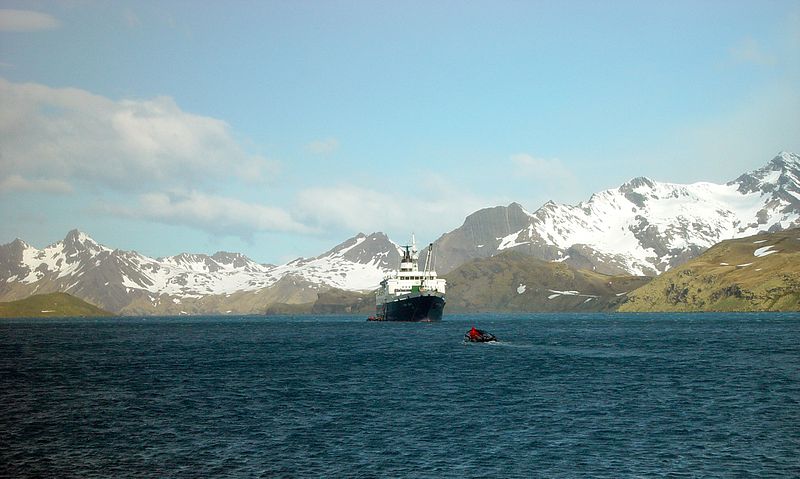 Sunrise brought a surprise from Antarctica: huge tabular icebergs surrounded the ship as the officers and expedition leader scouted Hercules Bay. The ice was quite beautiful in the bright morning light, contrasting white and blue against the dark mountain slopes of South Georgia. These are pieces of the