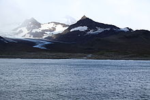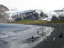 Gold Harbour is a smaller bay with all the wildlife concentrated between the Bertrab Glacier at one end and dramatic outcrops at the other. One could simply sit on the beach between rows of lazing elephant seals and watch molting King Penguins, Giant Petrels tearing into a fresh fur seal carcass, skuas scouting, and look up to the bluffs where a courting pair of Light-mantled Sooty Albatrosses shuttled between two ledges.