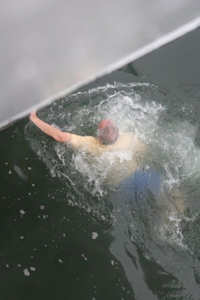 While hikers were on the ridge, an assembly of the brave readied themselves for a dip in the (somewhat) geothermally heated waters on the beach. About 30 hardy souls in swimsuits and some with hats as well ran into the ice water and tried to find warmth in the sand where the heated water bubbles up. It was a scene of shrieking in the beach mist, followed by confusion and hopping on the hot sand as people tried to figure out how to get warm/dry/covered without getting pernicious black sand into every fold of fabric. Staff handed out clean towels and ran ferries back to the ship where both roof hot tub (104˚ F) and Russian sauna (80˚ C!) awaited. The sight of people in full Antarctic garb next to bathers in swim suits brought home just how much chutzpah it takes to jump in here.