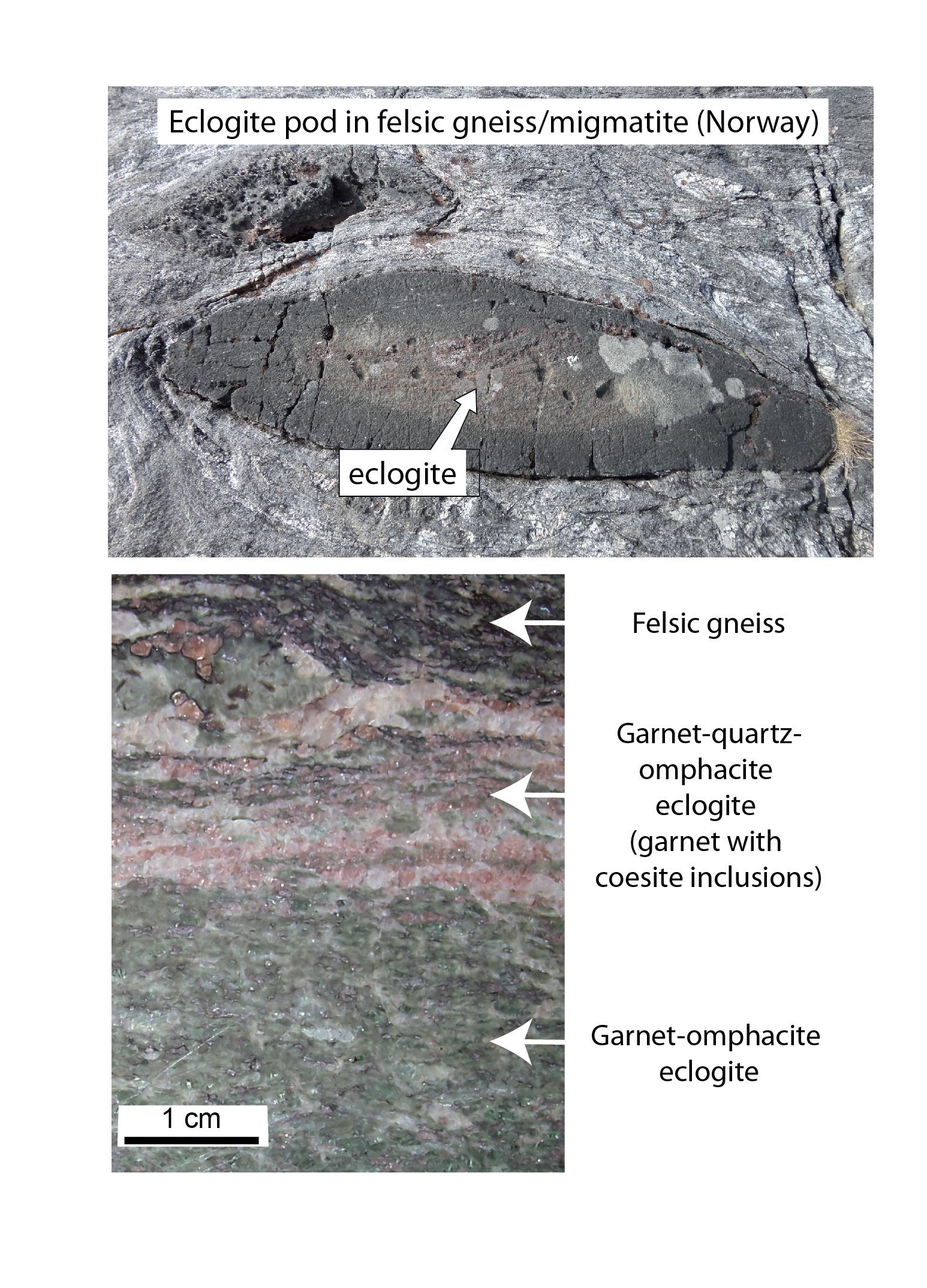 Fig. 2: (top) Mafic pod in Western Gneiss Region, Norway, with eclogite core, retrogressed (amphibolite) rim, and felsic host. (bottom) Polished slab of eclogite/felsic host contact; in this case, the coesite-bearing eclogite is a ~3 m thick layer concordant with felsic gneiss layering. Omphacite crystallographic fabrics are shown in Fig. 3.