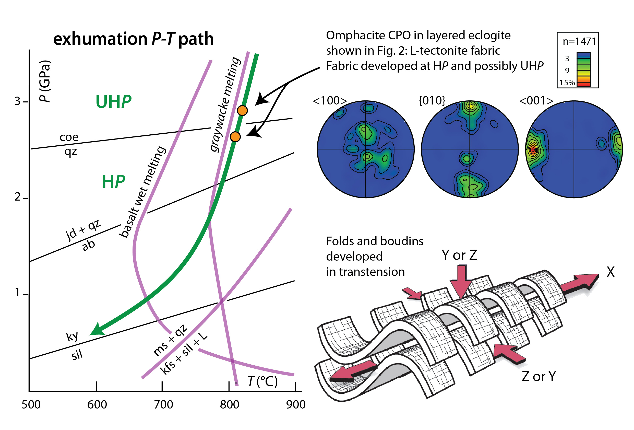 According to our hypothesis, if the entire segment of subducted continental crust is subjected to oblique divergence during exhumation, transtension structures and fabrics should characterize the deformation of UHP and HP eclogite. Our preliminary work on shear zones that contain layered eclogite (Fig. 2) suggests the omphacite crystallographic fabric is of the type encountered in L-tectonites that develop in constriction (Fig. 3). A systematic approach of this kind will establish whether constriction might have characterized rock deformation from UHP to low P.