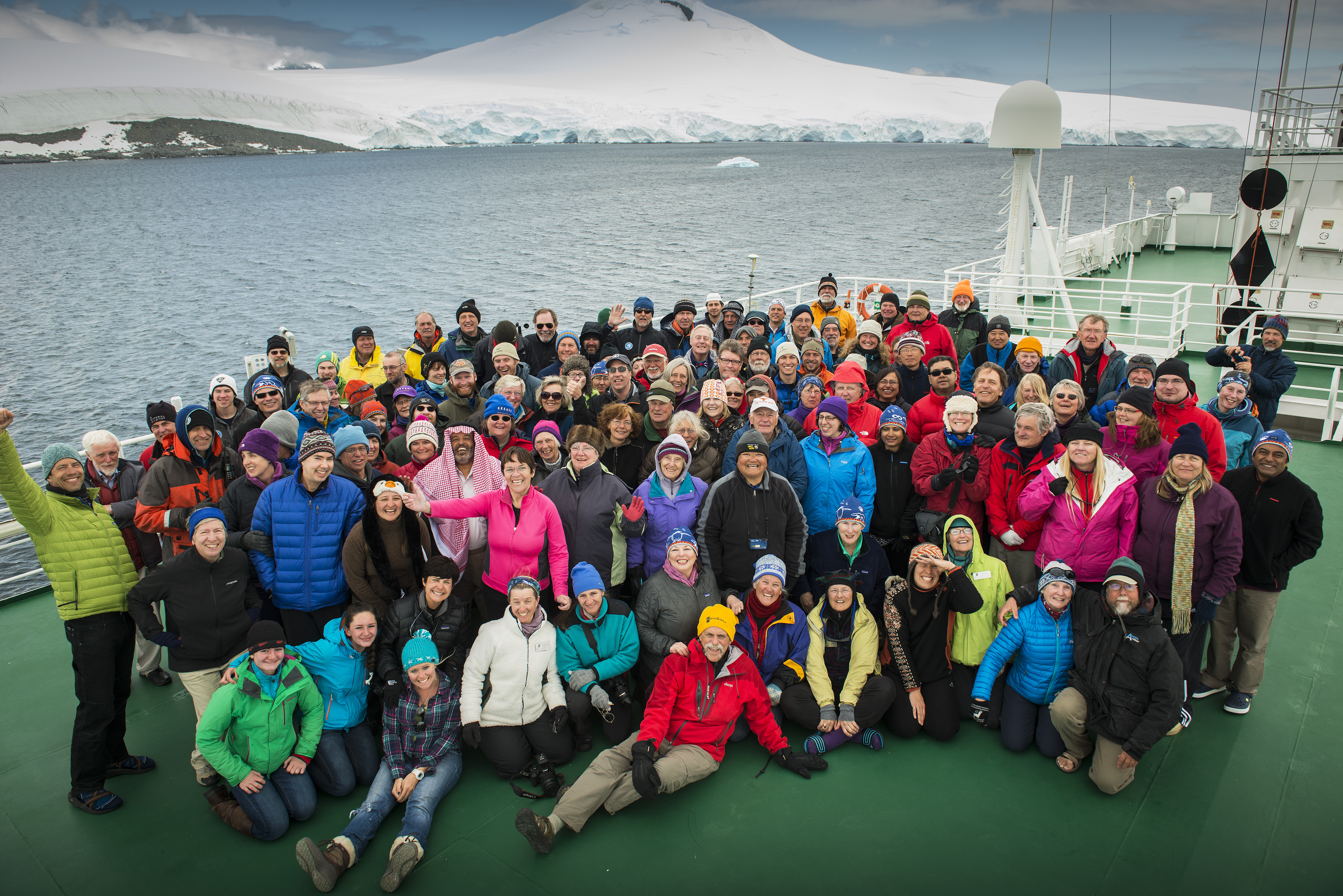 After our landing the Ioffe stayed in place and we invited all the Port Lockroy staff to join us for a hamburger barbecue on the back deck. It was fun and funny to sit at plastic deck chairs and tables, dredged up from some storage hold, watching the sunlight play on ice faces all around as penguins porpoised across the water below us. A dance party evolved after dessert. Silly penguin and reindeer hats came out of hiding and a certain geology lecturer sported a traditional Arab head-scarf, courtesy of our esteemed voyage participant from Saudi Arabia. Some of this headwear was still in evidence when everyone on board gathered for our official group portraits up on the top deck.