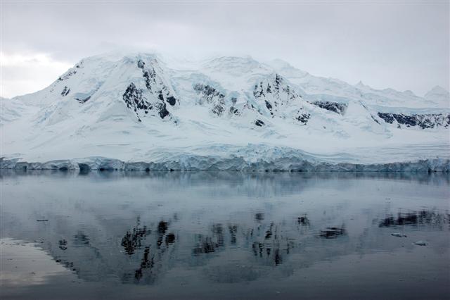 When we pulled anchor, the day was only just getting started. During the afternoon our ship cruised through Ted Cheeseman’s favorite passage in Antarctica, the winding Neumayer Channel, then across the Gerlache Strait to a favorite landing of manyAntarctic Peninsula visitors: Neko Harbour in Andvord Bay on the mainland Peninsula. Glassy waters reflected glaciers all around. Clouds covered our heads but looking back out of the bay we enjoyed seeing the low evening sun exquisitely lighting up the massive 10,000-foot mountains in the distance across the Gerlache Strait.