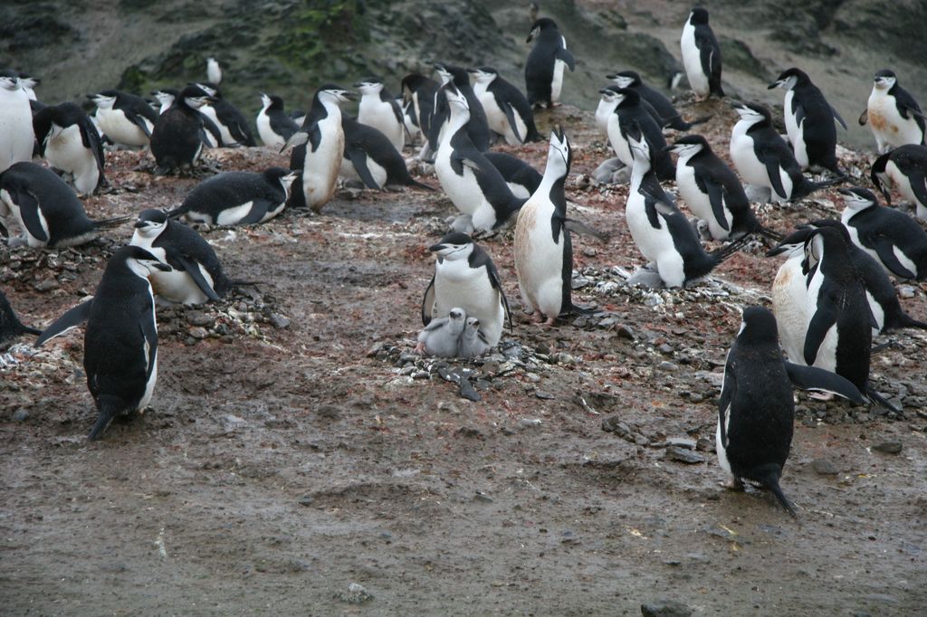 Chinstrap Penguins have some dense nesting clusters here too and their solid gray chicks were as big and fluffy as the Gentoos, but content to stay on their nest to beg. One lone Macaroni Penguin sat with its chick right in the middle of the Chinstrap colony. The local skua pair loosely guarded their own fuzzy brown chick nearby, where it was free to amble about. Two spotted Kelp Gull chicks also nearby kept each other company and investigated their surroundings in between visits by their scavenging parents. On the higher rock outcrops above all the penguins were a couple dozen nests of the huge Giant Petrels. Even with a spotting scope and binoculars trained on the brooding parents, staff naturalist Jim Danzenbaker never saw one stand up to reveal whether it had egg or chick on the nest.
