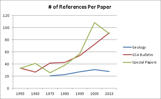 To find out, I examined the reference sections of Geology, GSA Bulletin, and GSA’s Special Papers in ten-year intervals from 1953 to present (1973 to present for Geology since it did not exist until then). I selected 20 random papers from each year and counted the number of papers cited and the number of characters for the entire reference section. For the Special Papers, I strayed into nearby years in order to get a full random sampling of content since some archive years did not contain enough edited volumes.