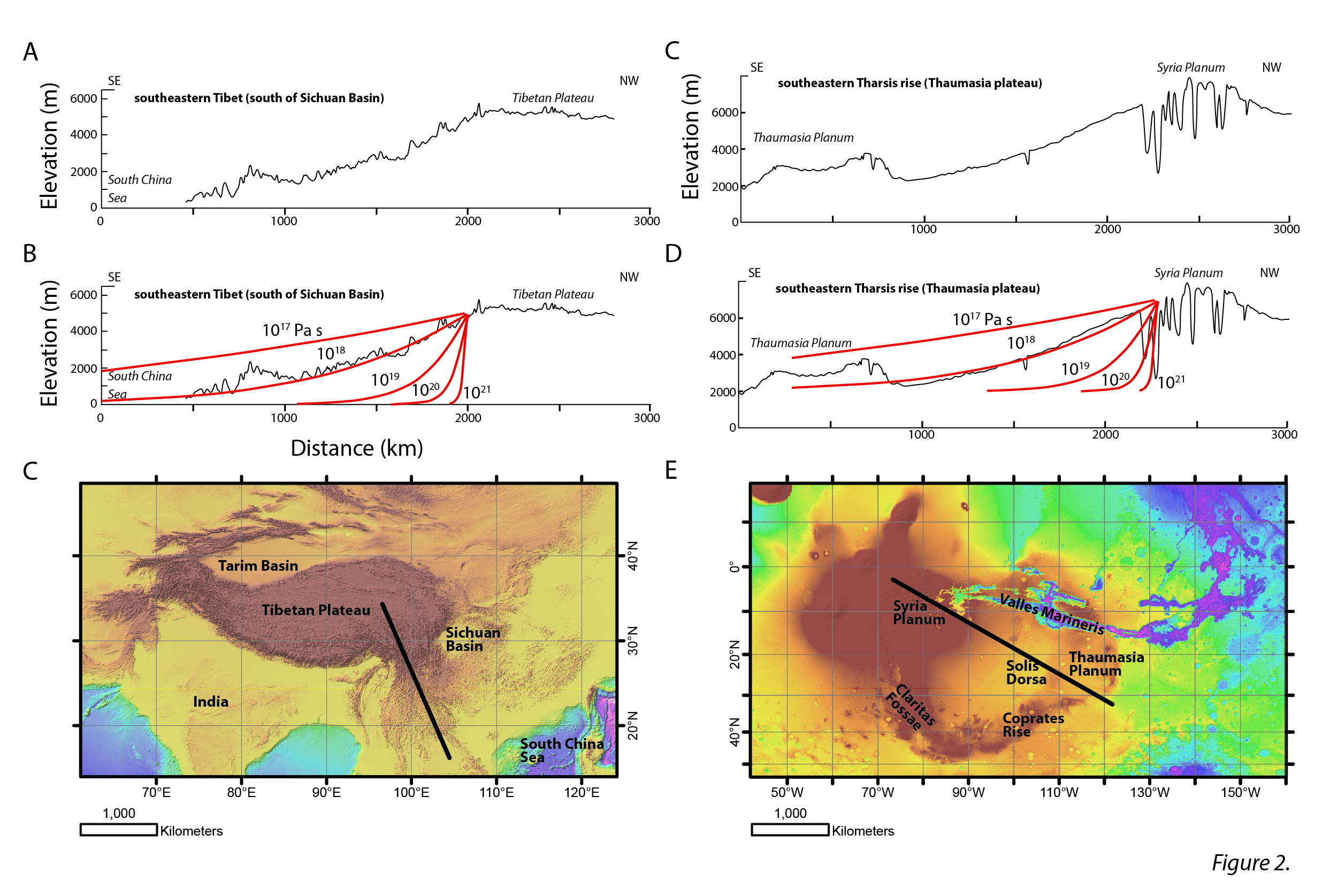 Both Mars and Earth have major topographic features of roughly the same dimension and height. On Mars, the Tharsis rise represents a continent-scale area of approximately 5.5-6 km mean elevation. This topographic feature is second only to the planetary scale Martian dichotomy that separates the thick, elevated crust of the southern hemisphere from the thinner northern lowlands. By comparison, the Tibetan Plateau is Earth’s most extensive, high elevation landmass, also standing at about 5 km mean elevation and a few thousand kilometers in length. We’ve likely not seen anything else like Tibet in Phanerozoic time and it is generally thought that Tibet is large enough to influence both regional and global climate. Both Tibet and Tharsis contain roughly doubly thickened crust and a crustal mass of ~3 x 108 km3, although the Tharsis rise is primarily magmatic in origin and Tibet results from crustal thickening due to continental convergence.
