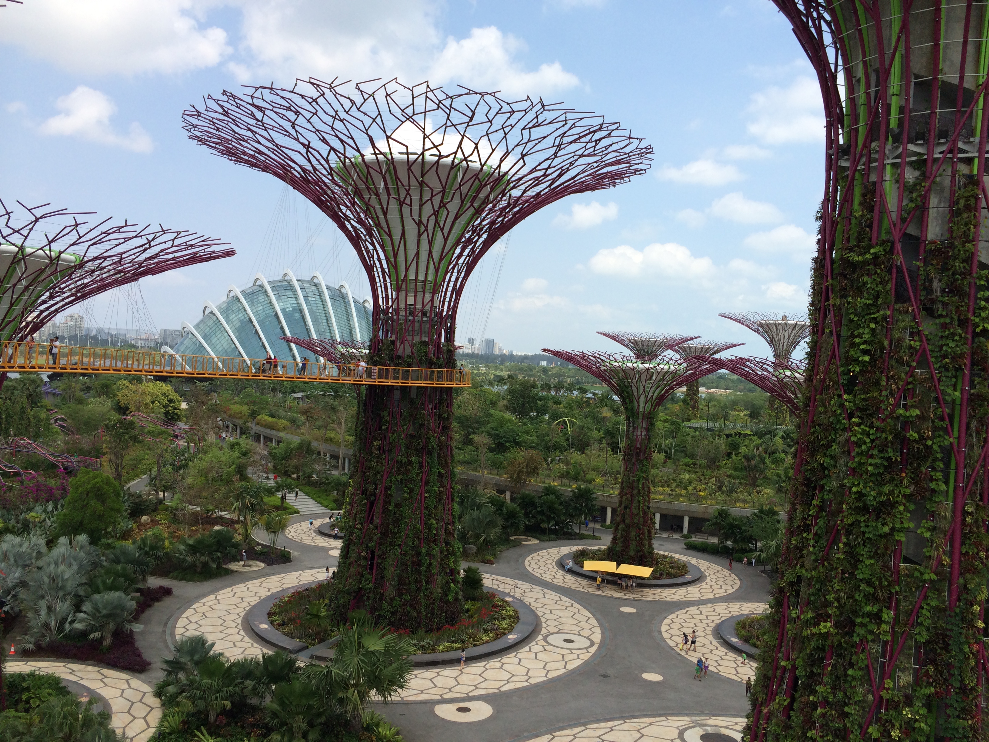 It’s a long plane ride! During a layover in Singapore, I was impressed by the vertical garden “supertrees” at Gardens by the Bay. Some of the “supertrees” are connected by an aerial walkway, and have photovoltaic cells on their canopies to harvest solar energy. The city is modern and clean.