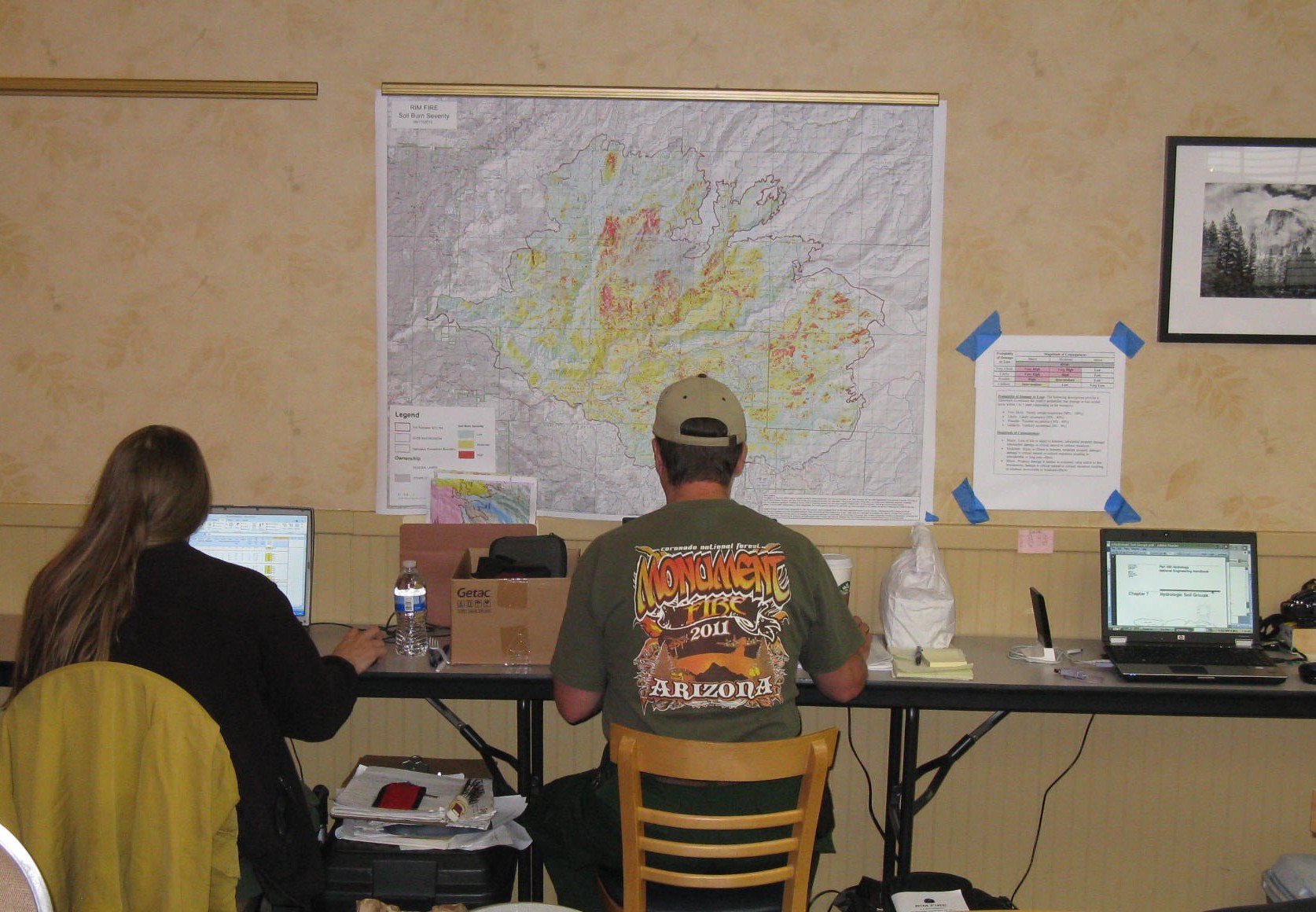 Figure 2 – With the soil burn severity map taped to the wall, BAER team specialists use their laptops to model erosion, water flow and other changes due to the effects of the fire on the landscape.