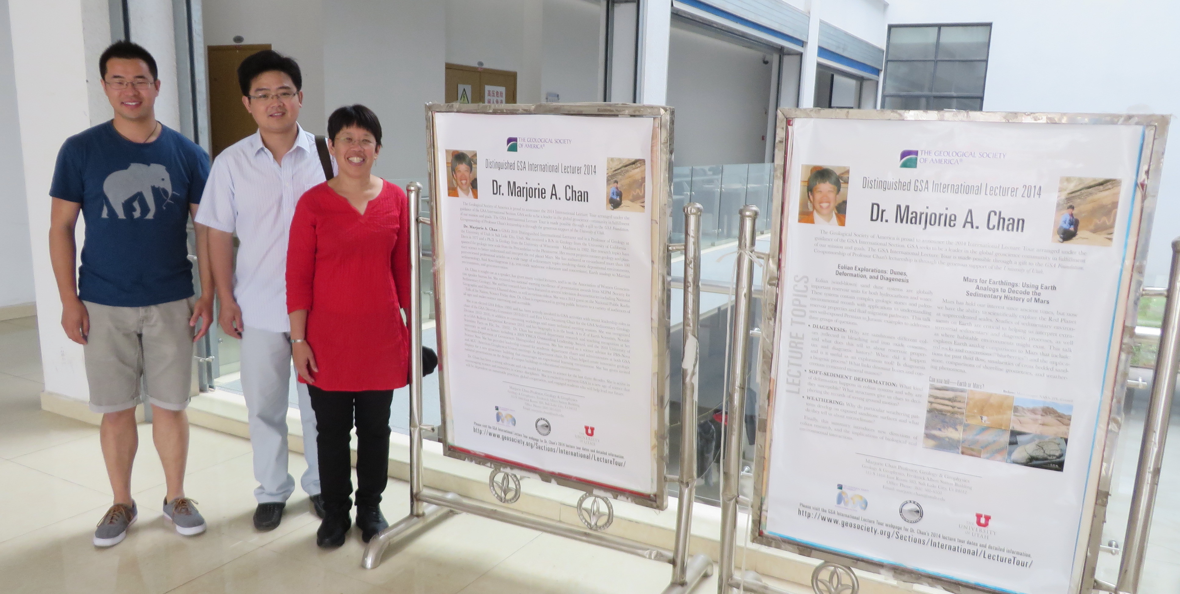 A large monolith announcing the Yangtze University stands at the campus gate.A large red banner greeted me across the entrance of Yangtze University. The banner announces part of the “Plan of World Famous Scientist Lecture- Marjorie Chan” (approximate translation of Chinese).In the School of Geosciences at Yantze University, we pose by the GSA talk signs. My faculty host Dr. Guangming Hu specializes in sequence stratigraphy. One of my current M.S. students Kangcheng Yin (far left) joined us for part of the China portion of the trip to act as my translator (translating both lectures and conversations) – very handy for Wuhan.The students were very interested in US graduate schools and application processes. The female students also wanted to know what the opportunities and challenges are for women scientists in America, and wanted to know my personal history.