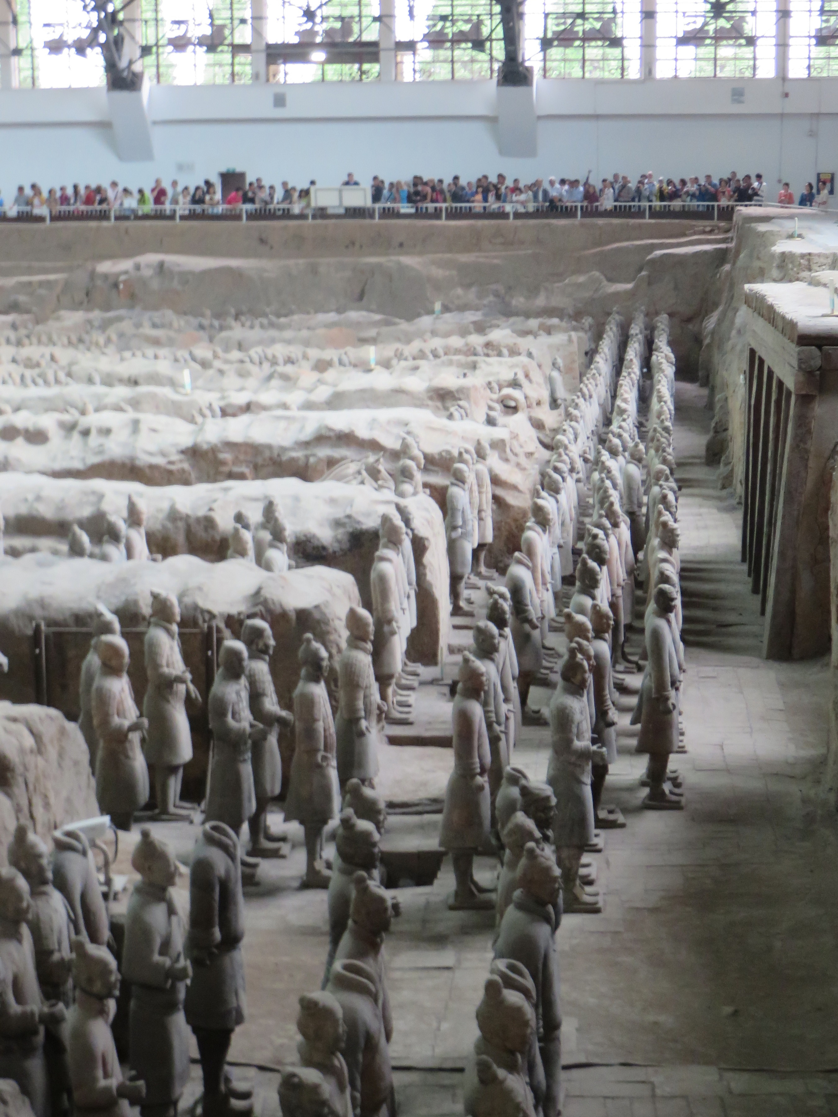 Today we went to see the impressive terra cotta warriors about an hour east of the city. The army of pottery soldiers guarding the tomb of the emperor of the first unified Chinese empire is hard to fathom. You can’t help but be amazed by such a unique site. Thousands of individually different soldiers line up in rows excavated from the loamy soil. The level of detail is astounding; each figure has different facial features, hair styles, and uniforms. The main tomb of Emperor Qin Shi Huang has only been probed in a few spots, and the terra cotta warriors form only a small part of the whole complex.
