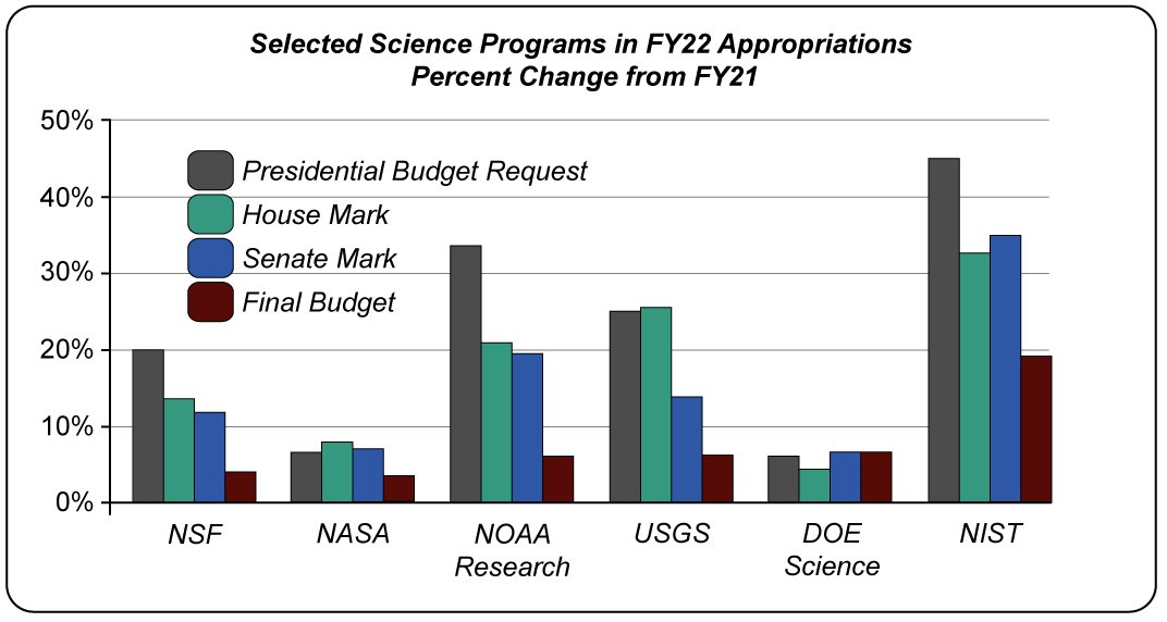 - The DOE Office of Science budget will receive $7.5 billion, which is a 6% increase from FY21 and slightly higher than the amount requested by the Biden administration. All of its six main research programs will receive increased funding, with Nuclear Physics and Biological and Environmental Research receiving the largest increase.