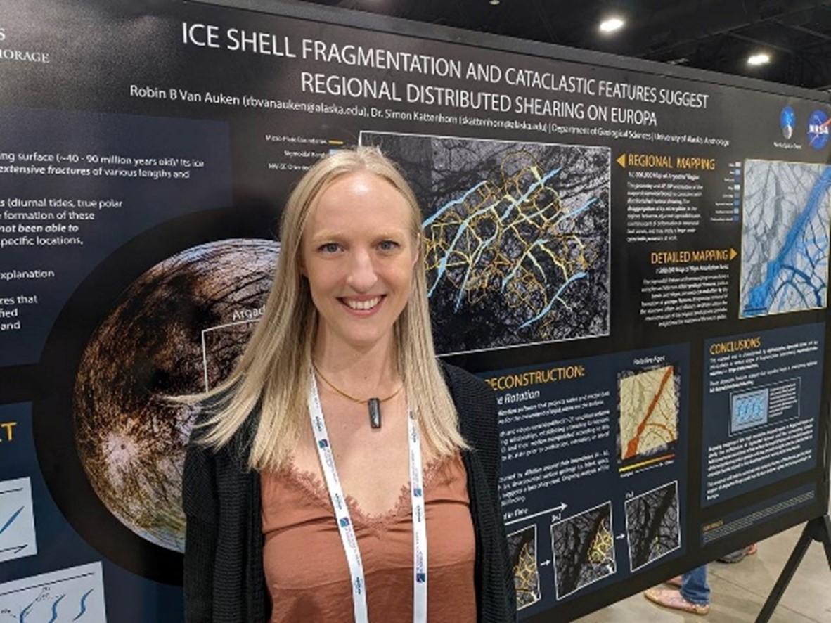 Robin Van Auken, a second-year master’s student at the University of Alaska-Anchorage, presented a poster titled “Ice Shell Fragmentation and Cataclastic Features Suggest Regional Distributed Shearing on Europa.” For her work, she uses a program called GPlates to interpret remote sensing data and reconstruct the movement and behavior of the icy surface of Europa.