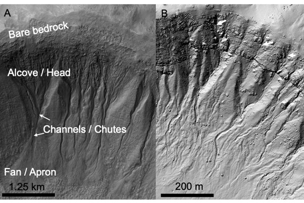 Planetary geomorphologists adopt an innovative approach, using Earth’s peculiar landscapes under diverse climate and sediment transport processes to gain valuable insights into Mars’ atmospheric and surface conditions. Palucis conducted her research using the Meteor Crater in Arizona, which serves as Earth’s analog to Mars’ features (Fig. 3). Formed approximately 50,000 years ago under cooler and wetter conditions, the Meteor Crater became a crucial site for Palucis to explore how a landscape resembling ancient Mars has evolved amid significant climate change. Gullies on Meteor Crater’s walls, formed by debris flows—a slurry mixture of sediment carried by fluid down the slope—provide a unique window into Mars’ past.
